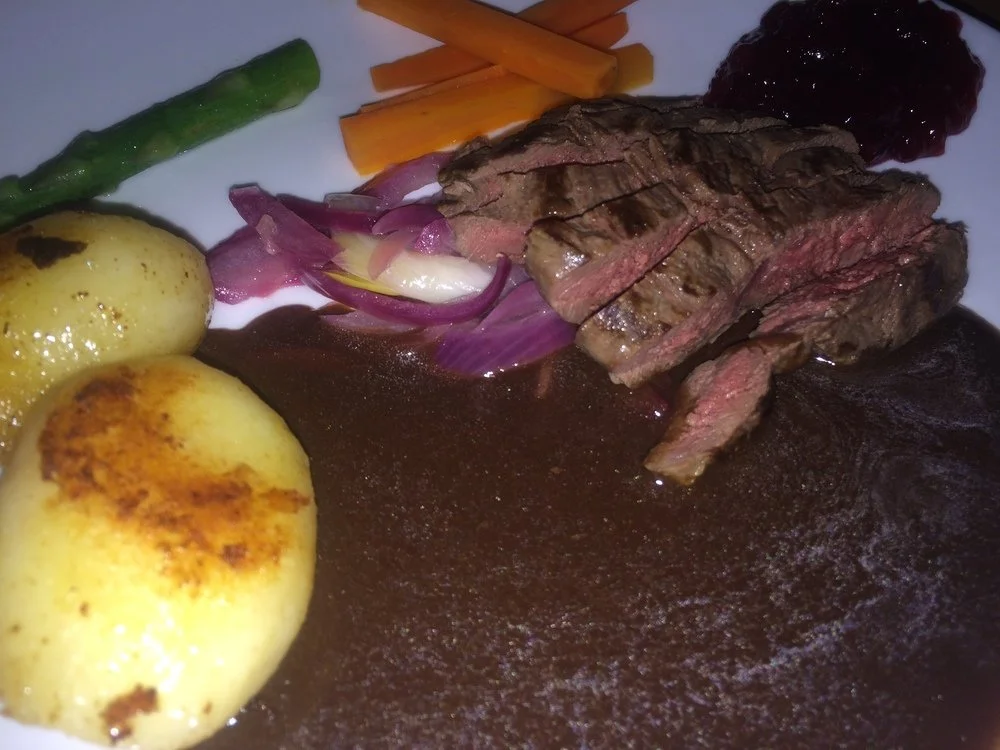 Reindeer, I ate reindeer...it was my #2 on I will not do list ...it was delicious...Reindeers sausage, reindeer burger and reindeer tenderloin. The Sami own all reindeer here ands you are not allowed to kill them if you are not Sami. The fine for killing a reindeer is apparently worse than killing a person!